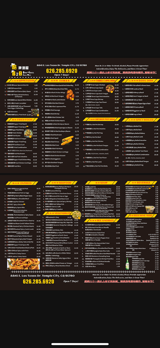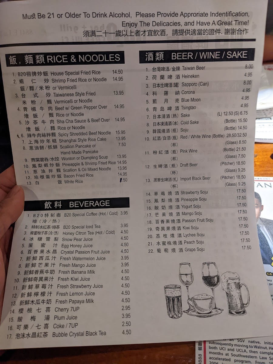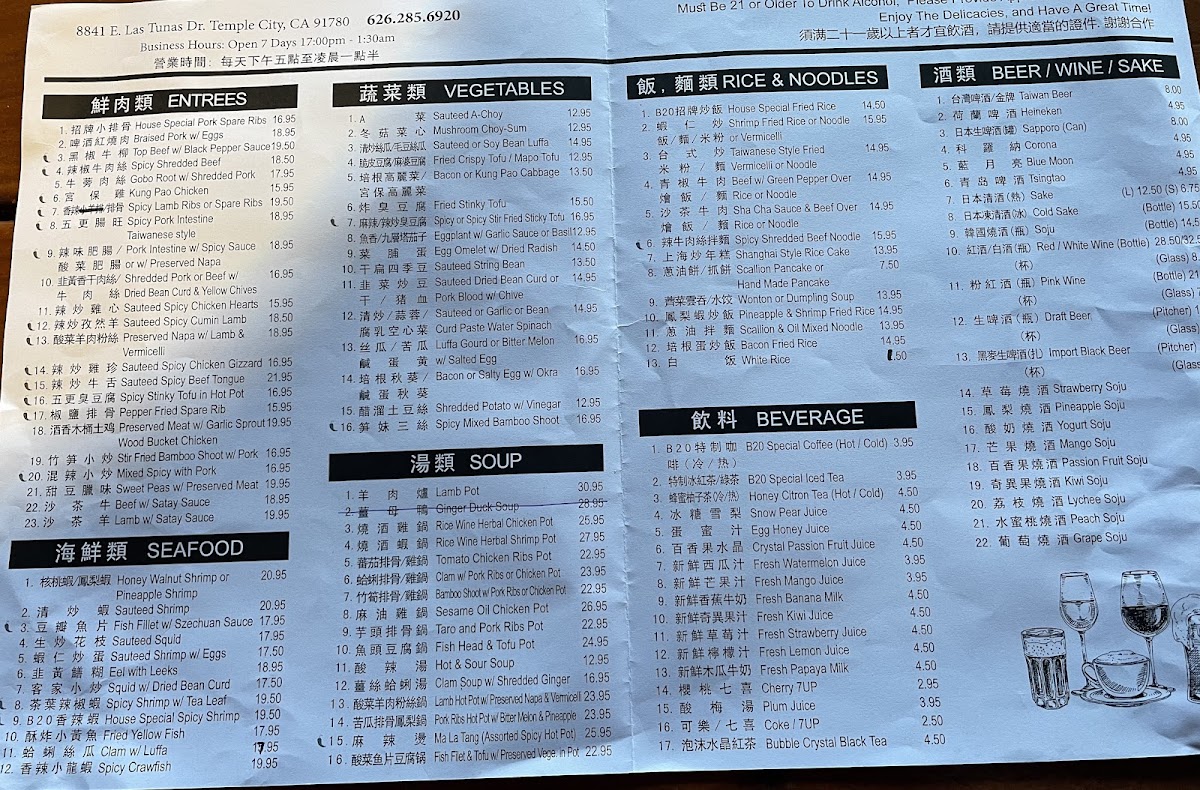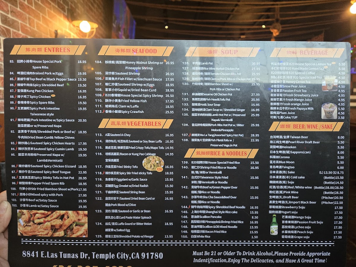 Signature items such as the Kung Pao Chicken, B20 House Special Fried Chicken Wings, and spicy pork intestine showcase the kitchen’s balance of bold spices and familiar textures, perfect for pairing with a cold beer or sake. For those seeking a more substantial bite, dishes like braised pork with eggs and Shanghai-style rice cakes offer a comforting touch, while seafood options including spicy crawfish and surf clam with basil add an extra layer of zest.